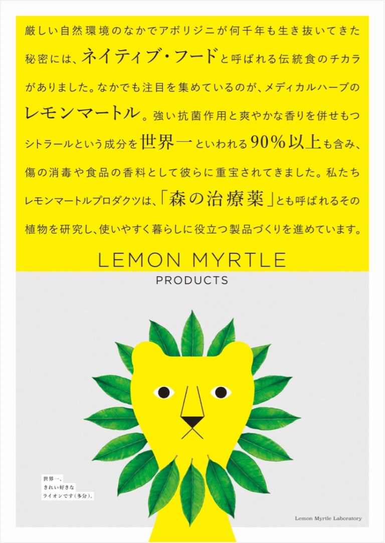最終的な目的は、OEM やレモンマートルオイル自体を販売することに定めたが、まず初めに自社商品としてレモンマートルオイルの利用方法を提案するために、「レモンマートルプロダクツ」というブランドを立ち上げ、商品開発を通じて、「レモンマートル」という商材のブランディングを行いました。